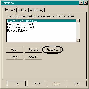 In order to change the Outgoing Mail Server, open Outlook, select Tools – Services…, highlight your Internet E-mail listing, and select Properties: