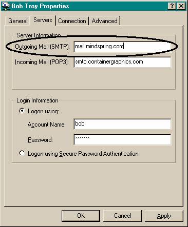 If the Outgoing Mail (SMTP) Server is listed as smtp.containergraphics.com, it must be changed to the mail server of your ISP. (See the list at the end of this document for some popular ISP’s and their mail servers.) After the change is made, click OK to close the open windows, then close and restart Outlook to activate the change.