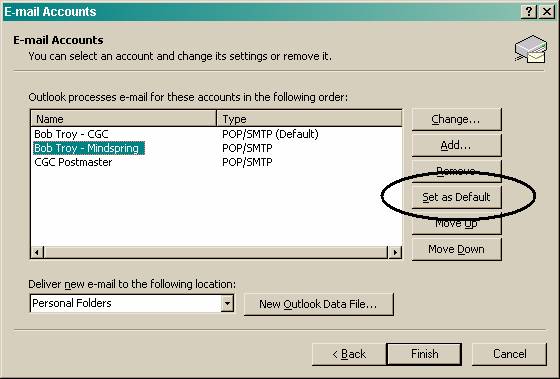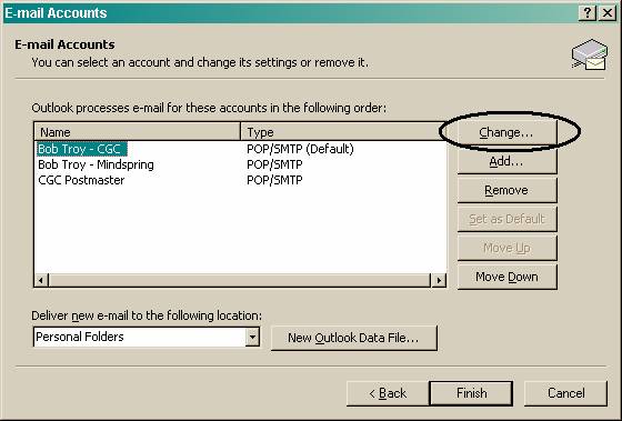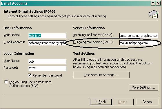 If the Outgoing mail server (SMTP) is listed as smtp.containergraphics.com, it must be changed to the mail server of your ISP. (See the list at the end of this document for some popular ISP’s and their mail servers.) After the change is made, click Next> to close this window, then Finish to complete the change. If the software so indicates, restart Outlook