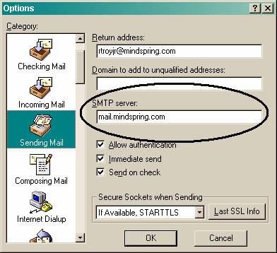 For people using dial-up or some type of consumer broadband connection to the Internet, where the IP address assigned to the computer will change from one session to the next, it may be necessary to change the Outgoing Mail Server (sometimes called the SMTP Server) listed in your mail software. For such connections, it will be necessary to route mail through the mail server of your Internet Service Provider (ISP). The following sections will describe the changes to make, depending on the specific system in use.